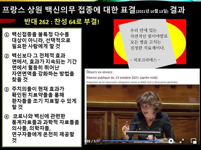 2021년 10월 13일 프랑스 상원에서는 백신의무 접종에 대한 표결이 있었습니다. 그 결과는 반대 262 : 찬성 64로 백신접종 의무화 안건은 부결되었습니다.