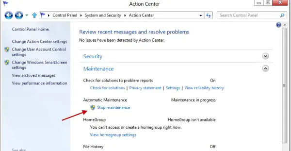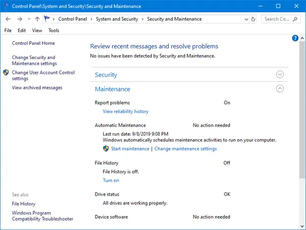 자동 유지 관리에 액세스하려면 제어판을 열고 시스템 및 보안 > 보안 및 유지 관리로 이동합니다. 여기에서 유지 관리에서 오른쪽에 있는 작은 화살표를 클릭합니다.