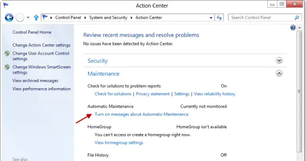 이렇게 하면 Windows가 자동 유지 관리를 모니터링하고 작업 표시줄의 관리 센터 아이콘을 통해 메시지를 표시할 수 있습니다.