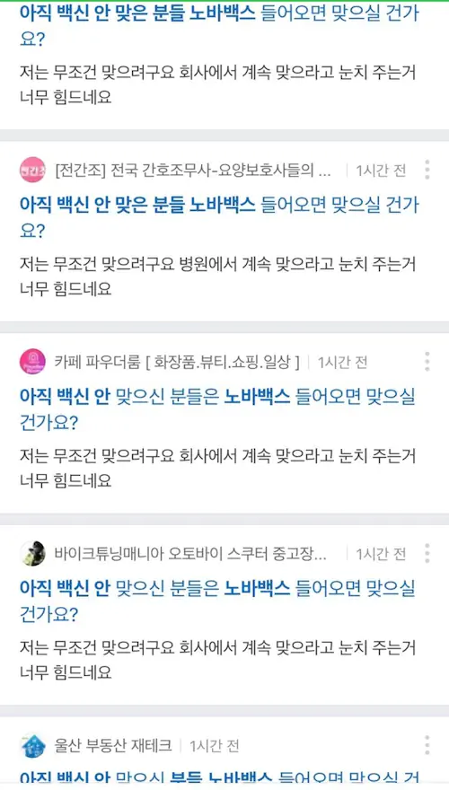 노바백스 백신 홍보를 위해 온라인 여론을 조작하는 세력이 있다는 의혹이 제기됐다. 15일 온라인에는 각종 온라인 카페와 커뮤니티에 올라온 노바백스에 대한 질문과 답변을 캡쳐한 사진이 올