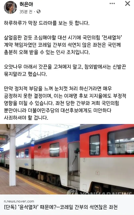 허은아 페북 윤석열차 코레일간부 좌천