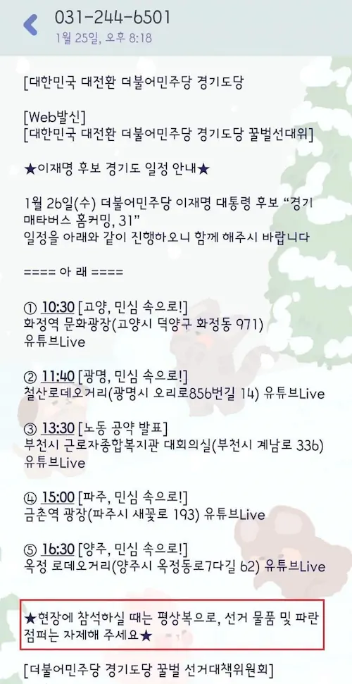 민주당 이재명 유세 파란색 점퍼 입고오지 말고 평상복 입고 오라는 문자 지령