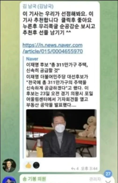 김남국이 손가혁에게 텔레그램으로 댓글조작 지령내리다가 걸림ㅋㅋㅋㅋ