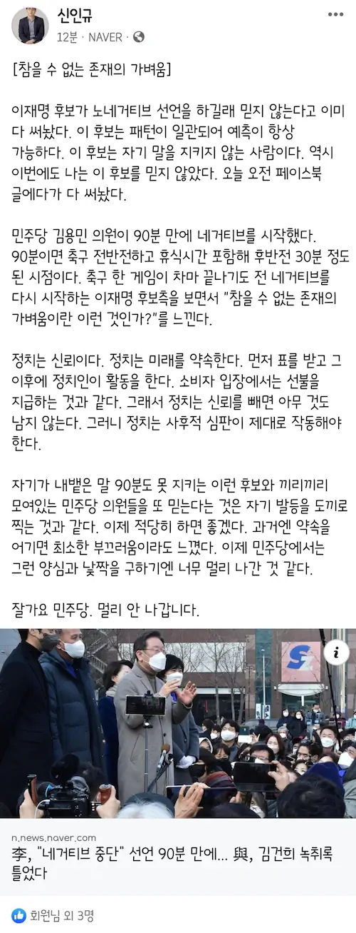 이재명 네거티브 중단 선언 90분 만에 자신은 네거티브 함