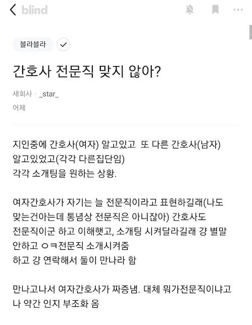 은행이나 결정사에서 전문직 취급해주냐? 전문성 있는 일을 하는지가 기준이면 버스기사나 용접기사도 전문직이라고 떠들고 다녀도 되겠네? 진짜 같잖은 소리하고 자빠졌어요 8대전문직, 항공기장, 기술사, 의치한 정도를 전문직이라 하지 간호사는 ㅋㅋ