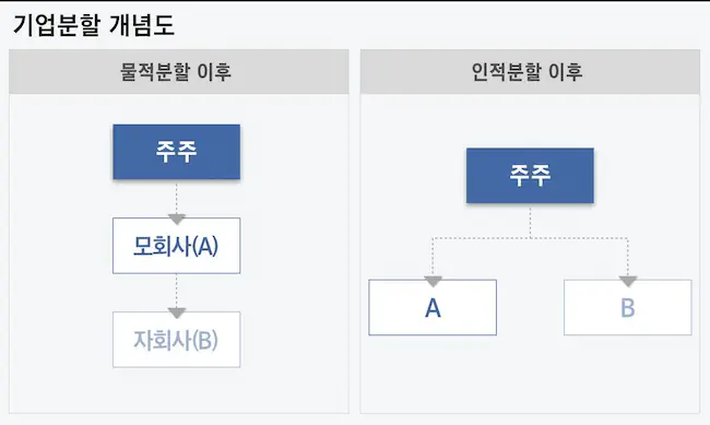 일단 분할같은 경우는 물적분할 과 인적분할 두가지로 나뉘어.