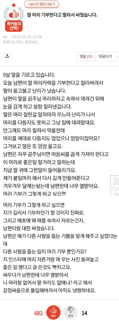 오늘 남편이 딸 머리카락을 기부한다고 잘라버려서 딸이 울고불고 난리가 났습니다.