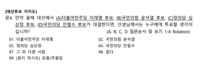 3) 문재인 지지하느냐는 질문을 먼저 받으면 윤석열 지지한다는 응답을 잘 못하게 되는 현상이 벌어지고 있다고 추측됨