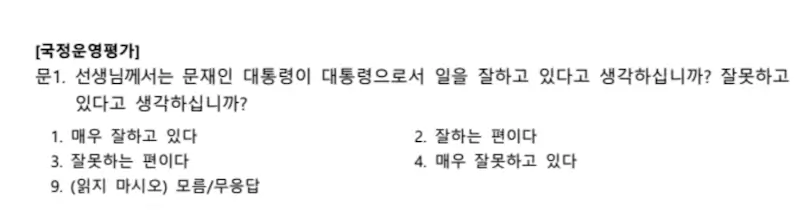 이게 심리적으로 작용하네여 문재인 지지 안함 걍 끊어 버리는게 많을듯 아님 조사 받는 사람도 심리적 위축되고 대선후보인데 질문1에 넣어야지 일부러 저러네