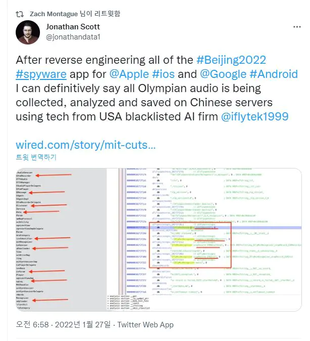 올림픽 참석시 무조건 설치해야하는 어플을 분석봤는데 미국 정부의 블랙리스트에 오른 iFlytek의 기술(신장 지역 감시 기술 제공한 곳)을 이용해서 마이크를 통해 음성을 비롯한 모든 소리들이 중국 서버로 전송된다고 하네요