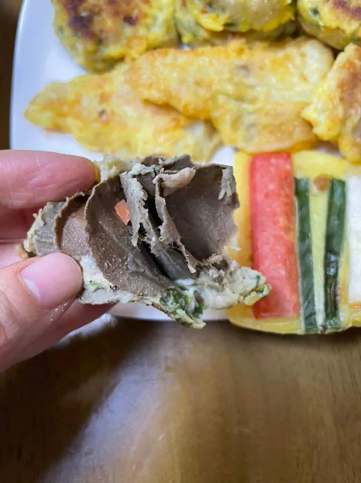혹시나 정말! 고기를 다져서 만드는 동그랑땡에 육전고기같은 비쥬얼의 얇게 저민 고기 덩어리가 들어갔는데 저나 와이프가 착각을 했을 수도 있겠다. 댓글을 보고 그럴 수도 있겠다는 생각을 했습니다(이미 씹어봤지만!). 그래서 일부 샘플을 잘라내서 씹어보고, 찢어보고, 태워보고, 말려서 샤프로 글씨도 써 봤습니다. 박스계열의 종이임을 확신합니다. 이게 만약 고기라면 인류는 종이로 대체육을 만들어도 될 것 같습니다 ㅋㅋㅋ