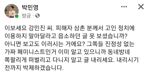 박민영 폐이스북 강민진 고인 정치적 이용에 비난