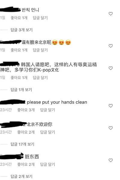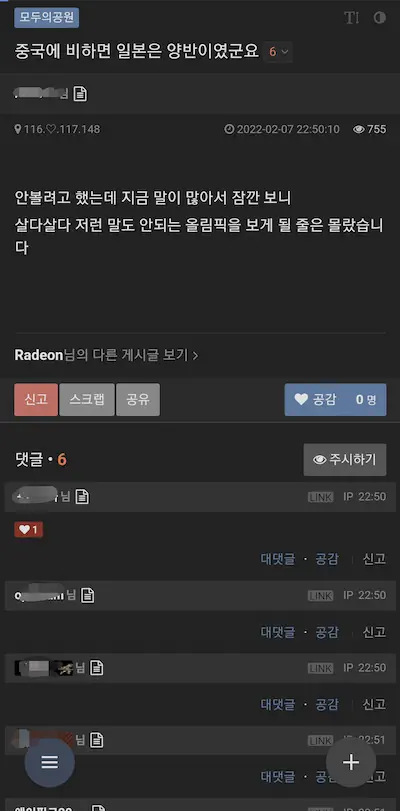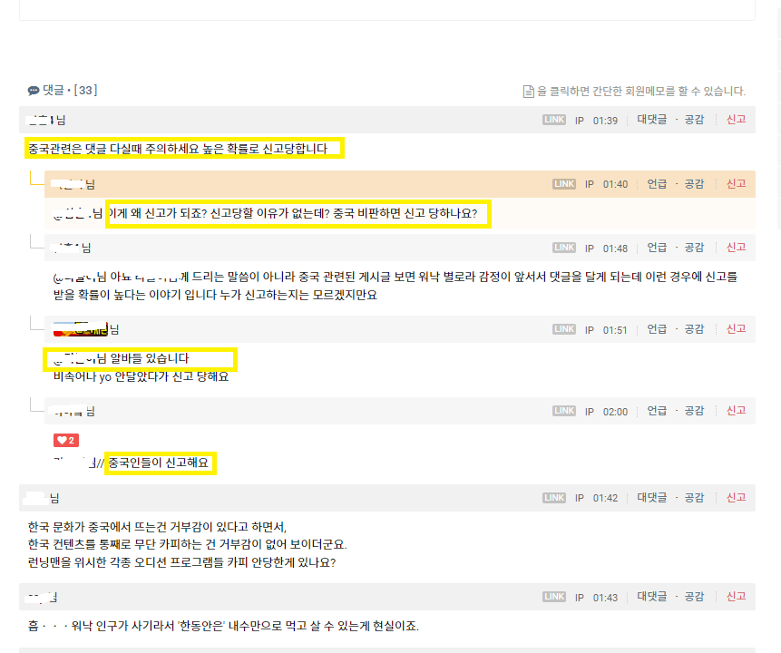 하지만 댓글에 중국 비판글은 신고 먹을 수 있다고 경고함