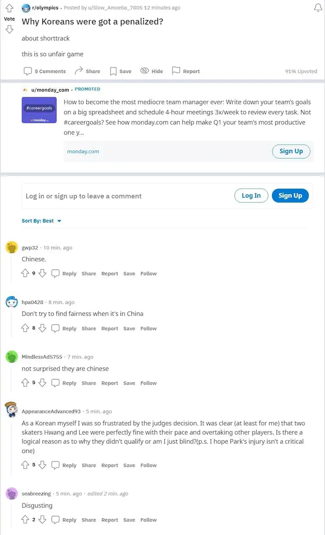 중국 쇼트트랙 편파 판정 외국 레딧 반응