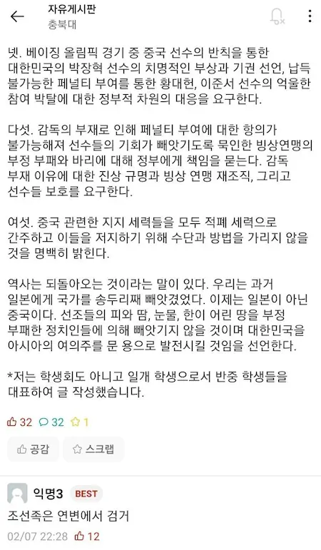 충북대 에타 중국 편파판정 반응 반중 선언문