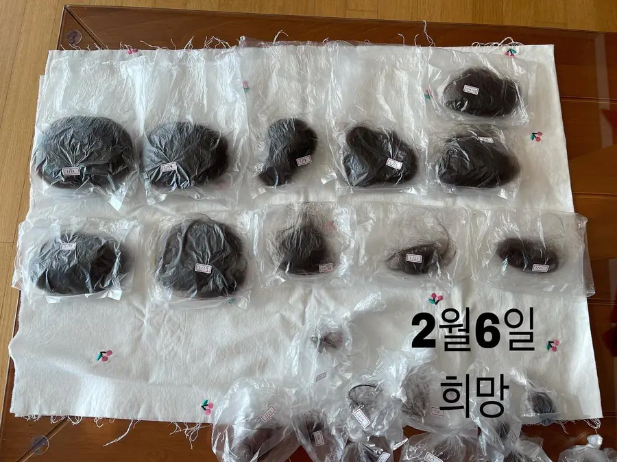 감은후 머리카락은 물에 젖은 상태라 모울수가 없엇다.항상 드라이후 마른 머리카락만 봉지에 날짜 기입해 저렇게 며칠 빠진 한달치를 모앗다.