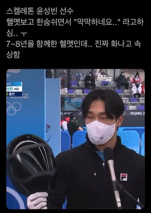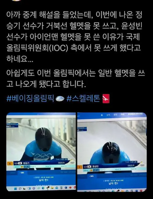 아쉽게도 이번 올림픽에서는 일반 헬멧을 쓰고 나오게 됐다고 합니다.