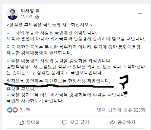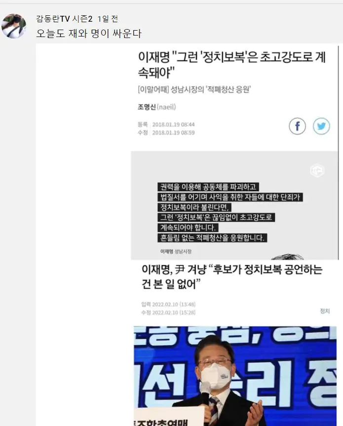 근데 그런 윤석열을 정치보복 하지말라고 까는 이재명은 오히려 지가 대놓고 '정치보복' 워딩을 쓴적이 있음.