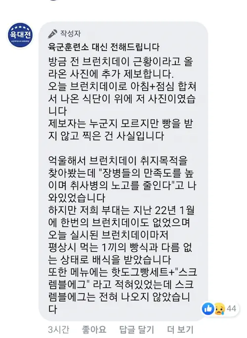 브런치데이에 일반 핫도그 빵식 나온게 잘못 아님? 글 읽어보면 스크램블에그 안나왔다고 써있는데 브런치데이가 아침+점심 합쳐서 나온 예산으로 한번에 먹는건데 일반 빵식나오는게 문제지 ㅋㅋㅋㅋ