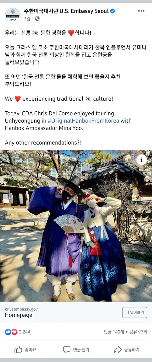 중국이 한복 지들꺼라고 우기니까 한국정부 대신해서 한복 한국꺼라고 공인해줌
