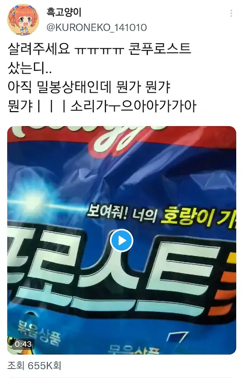 살려주세요 ㅠㅠㅠㅠ 콘푸로스트 샀는디.. 아직 밀봉상태인데 뭔가 뭔갸 뭔갸ㅣㅣㅣ소리가ㅜ으아아가가아
