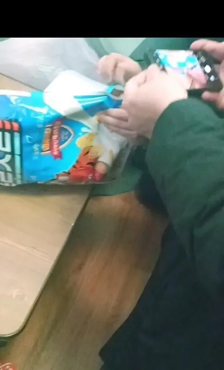 2. 묶음포장으로 가운데 굴곡이 생겼고 구멍으로 바람이 나가는 소리와 동시에 시리얼 내려가는 소리가 뜨문뜨문난거였습니다.