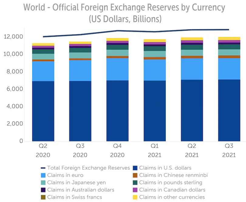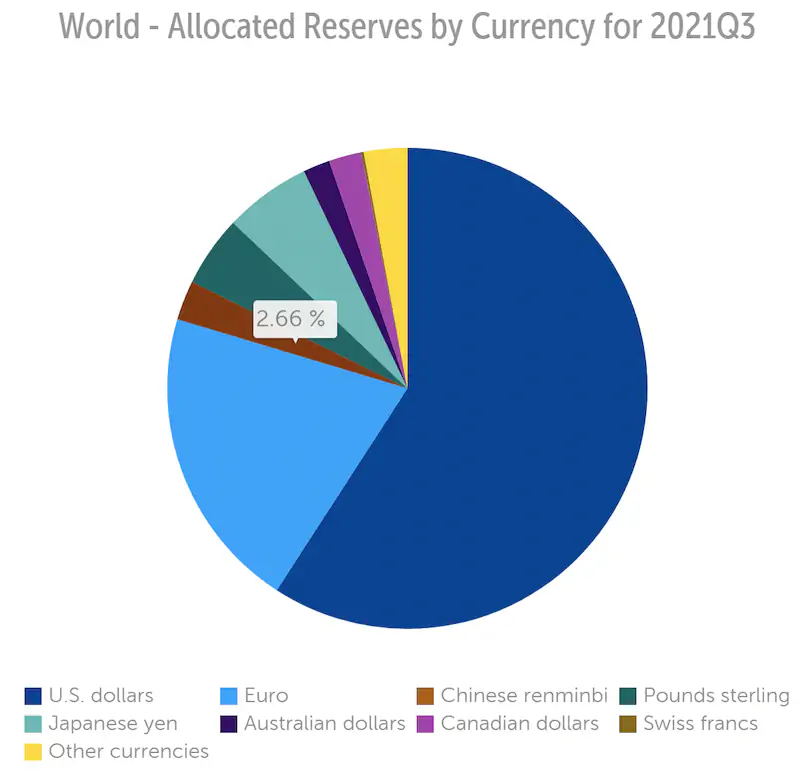 당연하게 미국 달러(59.15%)가 대부분을 차지하고 있으며 유럽연합의 유로(20.48%)도 상당한 지위를 갖고 있으나 달러와 달리 유로는 대부분 유럽 국가들이 셀프로 갖고 있는 것이라 달러와는 지위가 많이 다르고 세번째는 일본 엔화(5.83%)이며 GDP로는 일본을 추월해 3배 규모에 달하는 중국 위안화는 (2.66%)에 불과하다.