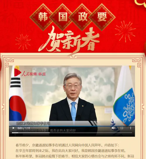 중국 중공 인민망에 인사하는 이재명