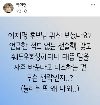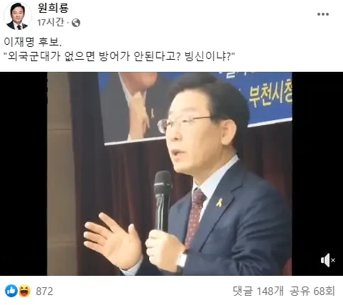 이재명 왈 "미군 없어면 방어 못해? ㅂㅅ이냐"