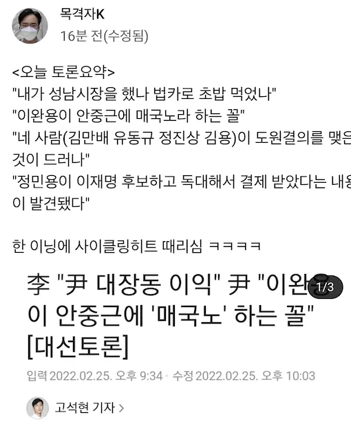 댓글로 "나도 그래도 이재명 찍을려했는데 토론보고 안되겟어서 안철수로 갈아탈려고" 달아주면 바로 발작시작함 ㅋㅋ