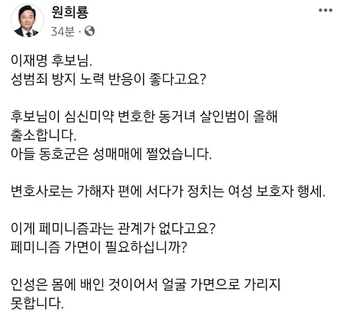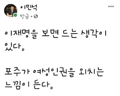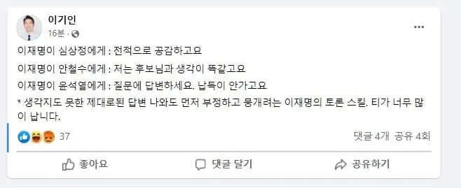 대통령 후보라면 그래도 어느정도 품격이 있어야 하는데, 이재명은 강성노조 노조위원장 같은 이미지.