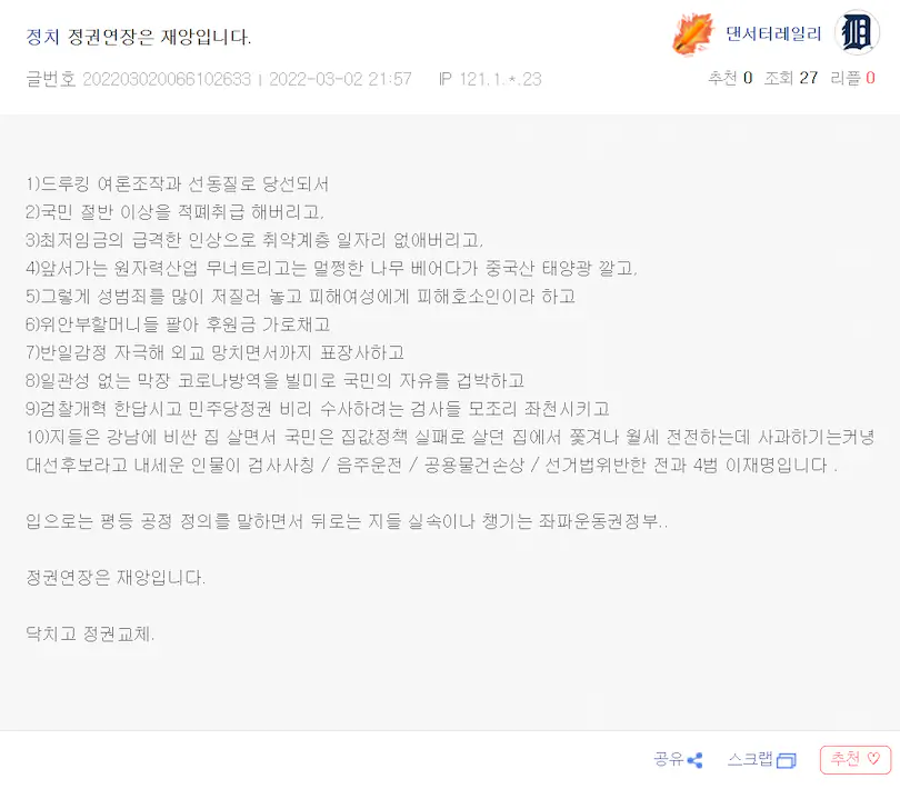 | 블라인드 부정선거 선관위 직원 막말 논란 (0) | 2022.03.06 |