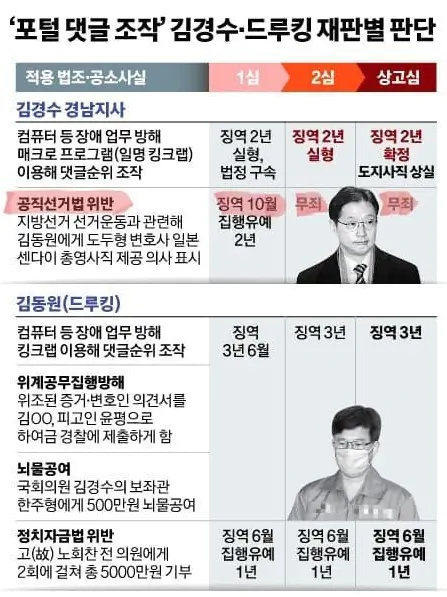 이 사건을 공모한 더불어민주당 김경수는 한때 대권 주자로도 거론되었지만 징역 2년의 형량을 확정받아 경남도지사직을 상실하고 지금은 깜빵에 있어.
