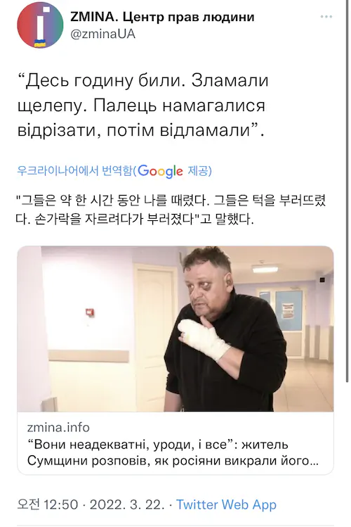 - 이고르 씨는 12명의 러시아군에게 집 근처에서 납치되었음. 러시아군 무리는 이고르 씨를 1시간 동안 폭행했음. 머리를 10번이나 가격하고 손가락을 자를려다가 부러트렸다고 함.
