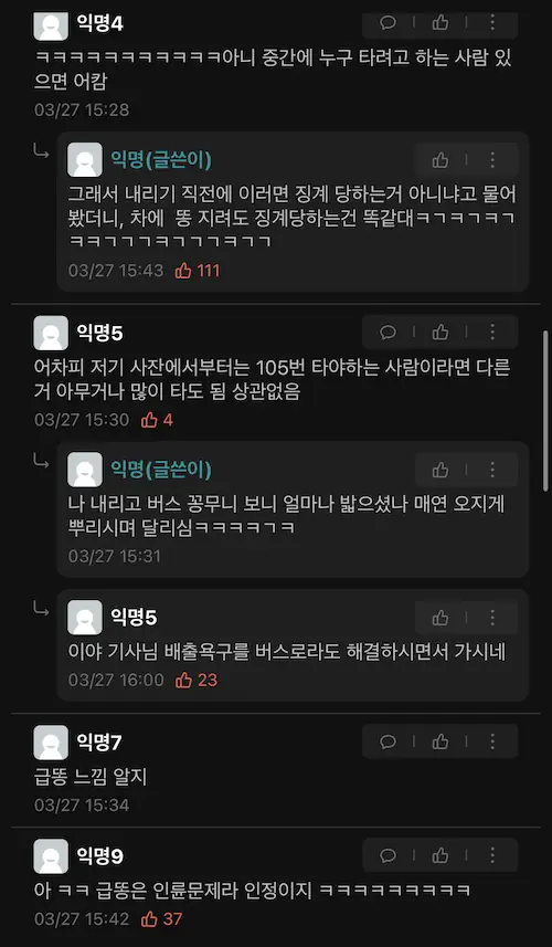 근데 진지하게 버스운전 기사 화장실 문제 때문에 방광염 걸리고 그런 경우 많다고 본거 같음