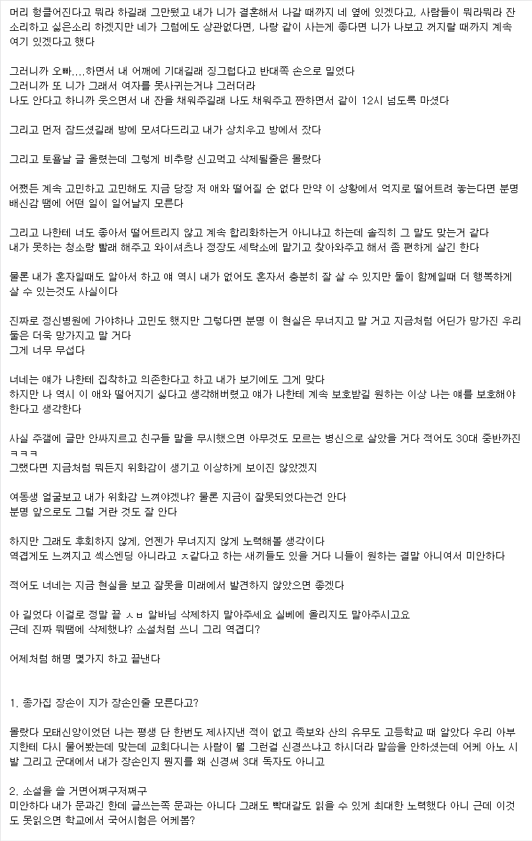 내가 미안해 근데 나한테는 걔나 너나 똑같이 여동생이고 똑같이 소중한데 너는 같이 살고 걔는 혼자 살게 내버려두는 건 좀 아닌거 같다고....