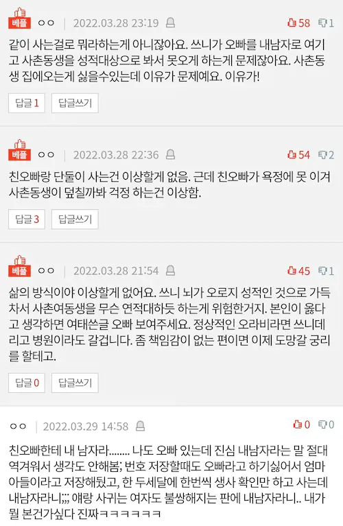 제가 그래서 오빠한테 아무리 그래도 여자애랑 같이 살다가 뭔 일 일어나면 어떡하려고 그러냐 친척들끼리 서로 얼굴 붉힐 일 있냐고 따졌어요