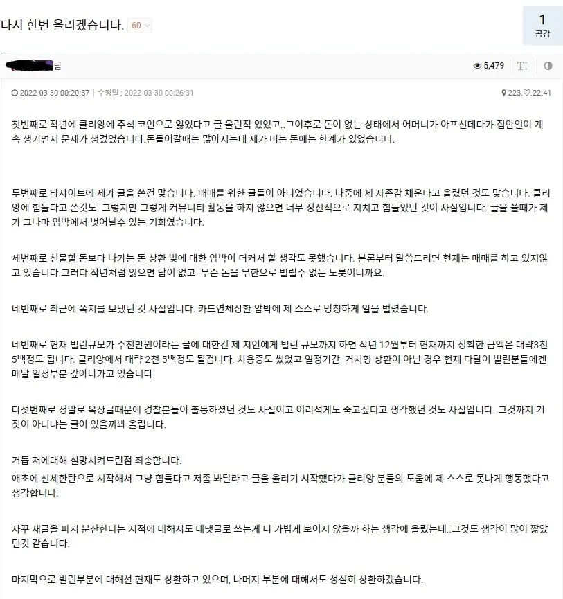 이번엔 아버지 병원비를 지불해야하는데 연체중이라 돈이 없고 어쩌구저쩌구… 알고봤더니 코인커뮤니티에서 하루에 글 수십개씩 쓰는 레버리지트레이더였음. 클량 회원들 예상으로는 레버리지 청산당했을걸로 추측 중.