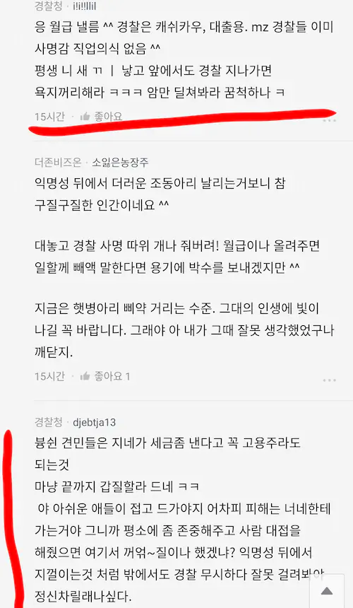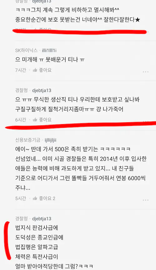 기분 좋으라고 명예니 뭐니 들먹여주고 병신대통령 취업난 속 나름 공시라고 띄워주니까 진짜 지들이 머라도 된 줄 아노 ㅋㅋ 경찰대 테크 탄 것도 아니고 경찰 안했으면 지들이 뭐 떵떵거리고 살았을 줄 아나 ㅋㅋ