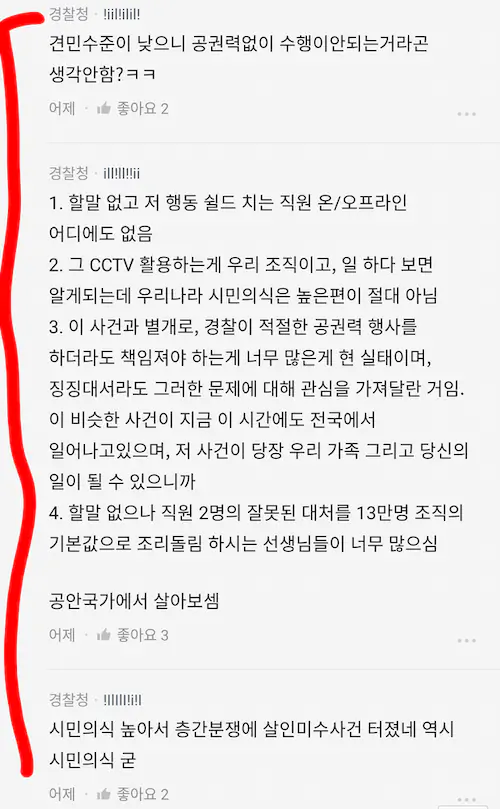 경찰에 존재 의의를 부정하는 말을 지가하네 ㅋ 경찰 자질을 탓하기 전에 성숙한 시민의식으로 사건사고를 내지마라..? 뭔 궤변이냐 ㅋ
