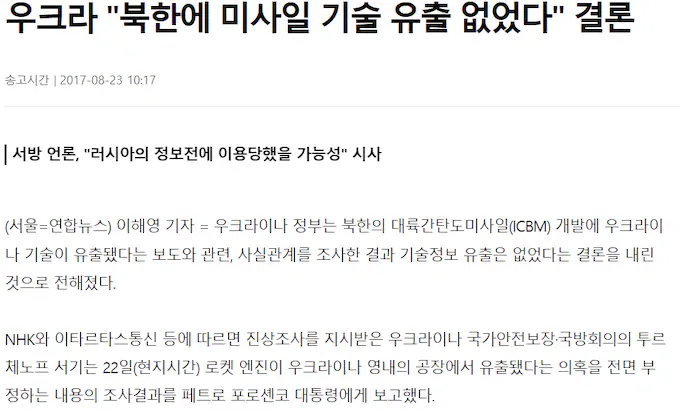 심지어 미사일 기술 빼돌리려는 북괴 공작원들 애국노 정권때 체포해서 서방세계에 우리가 1세계 들어가려고 노력하고있다 어필한적도 있는데 러시아에서 응 아니야 우크라이나에 북한 기술지원해주는 팀있음 ㅅㄱ 이지랄 한걸 진짜로 믿어주는 애들이 많았고 언론에서도 수용해서 우크라가 북괴 미사일 만들어준거로 확정지어 놓음