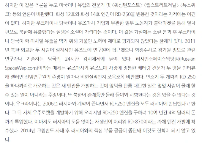 북한이 발표한 백두엔진이 사실상 구소련제 RD-250 엔진인게 밝혀짐.