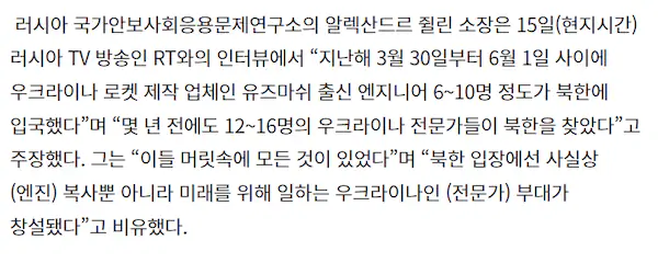 단순한 기술진 몇명으로는 수개월만에 엔진 하나를 새로 만드는건 불가능하며 우크라이나에도 없는 미사일 엔진을 북한한테 넘겼다는건 소설이라는 여러 전문가들의 반박이 나옴