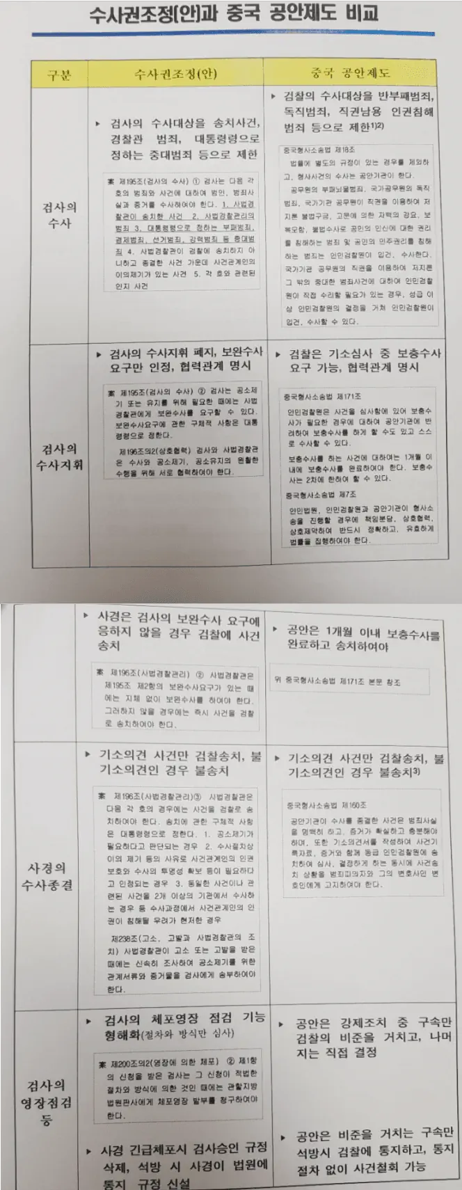 더불어민주당이 검찰의 선진화라는 미명 아래 추진 중인 '검수완박(검찰 수사권 완전박탈)' 입법은 중국검찰 제도와 흡사하다는 비판이 검찰 검사의 의견