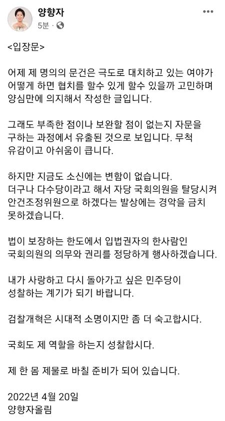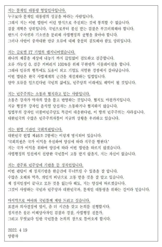 더불어민주당이 '검수완박'(검찰 수사권 완전 박탈) 법안 처리를 서두르는 상황에서 양향자 무소속 의원 명의의 검수완박 속도조절론 문건이 19일 논란이 됐다. 민주당 출신인 양 의원 명의의 문