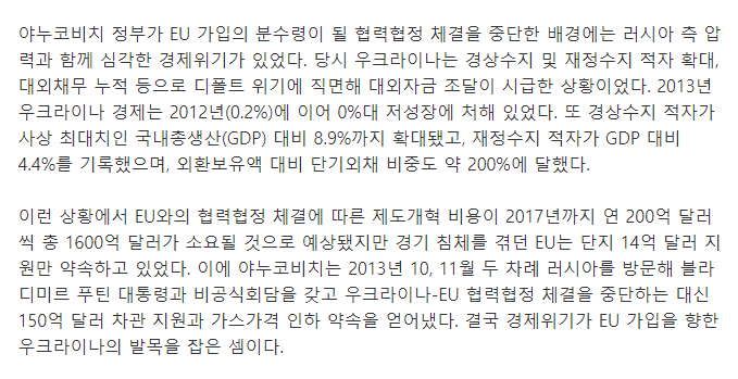 그 후 러시아는 우크라이나에게 150억 달러 차관 & 가스요금 인하 카드를 보여주며 자신의 편으로 끌어들임. 우크라이나 국민들은 EU와의 협상이 왜 파토났는지 똑똑히 알게 되었고 그 직후 유로마이단 사태가 발생함.