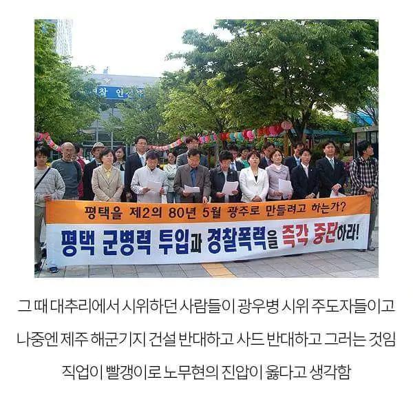 곧 노동 변호사 출신이 노동자를 탄압했으니, 참으로 모순이 아닐 수 없다. 세 명의 노동자와 농민이 진압과정에서 사망하였다. 2005년과 2006년 두 차례에 걸쳐서. 재발 방지를 약속하며 유감을 표했지만, 똑같은 일이 또 벌어졌다. 이와 같은 사건으로 참여정부는 비판에 직면하게 되었다. 다른 정권에서도 이런 일이 있었다고 하지만 진보진영이 받은 충격은 상상을 초월했다.