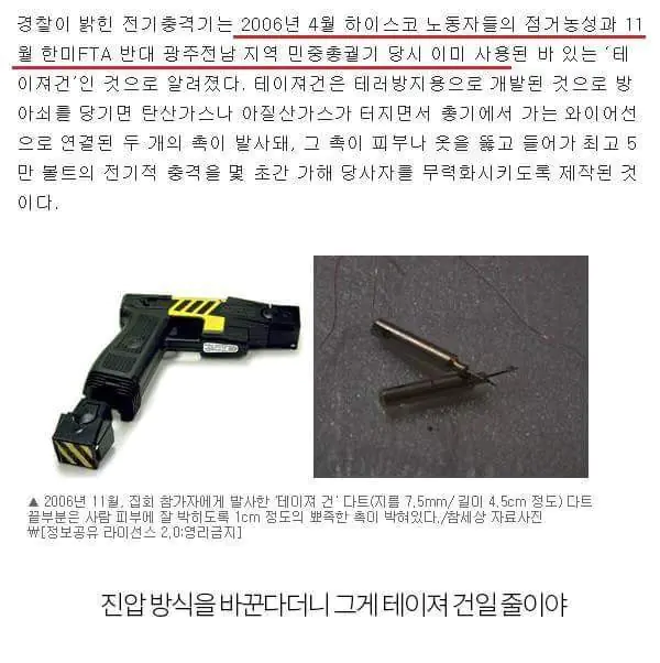 당시 진압현장에서 집회와 파업과 시위와 관련해 불법적인 탄압이 자행되었으며, 심지어 테이저건을 사용하기도 했다. 참조 공권력이란 언제든 인명을 손상 시킬 수 있는 위험이 있기 때문에 경찰의 진압 장비들은 특별한 요건을 충족할 때만 사용할 수 있다.
