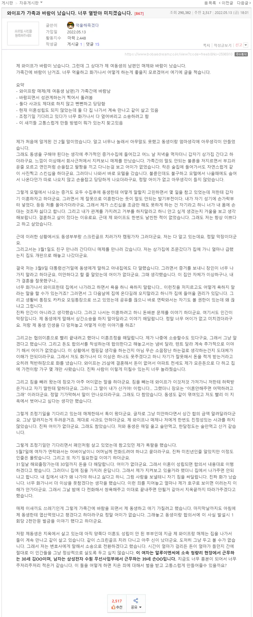 와이프가 가족과 바람이 났습니다. 너무 열받아 미치겠습니다. | 보배드림 자유게시판