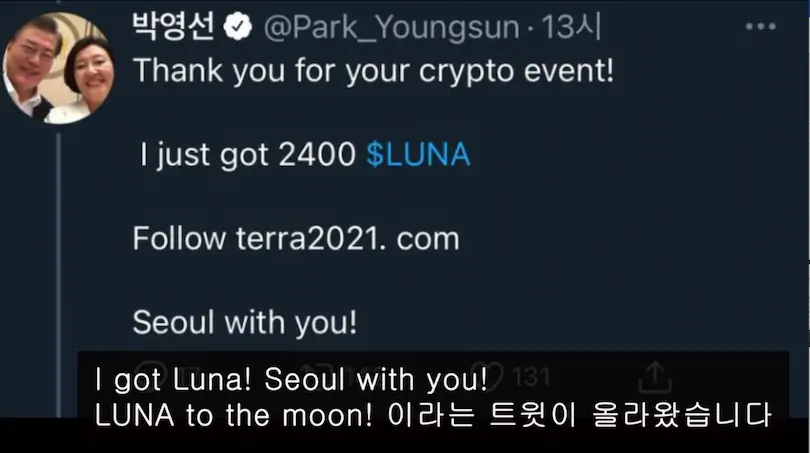 근데 !! 그 말을 한지 얼마 안되서 2021년 3월 17일 박영선 의원의 트위터에 I got Luna! Seoul with you! LUNA to the moon! 이라는 트윗이 올라옴